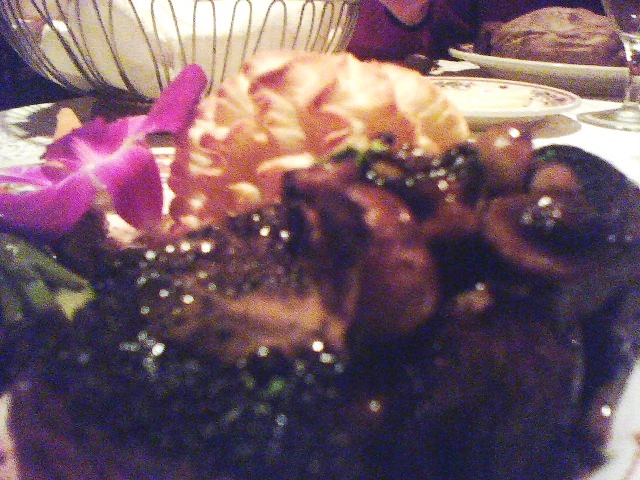 I really was just trying to capture the Scrimshaw Potato, which you can see in the background, all frilly and golden. It was complete and utter heaven. I brought home more than half of my steak, because I was so full of the potato. The steak was terrific as well, cooked perfectly medium-rare as requested, and finished with a sweet and nutty mushroom cognac cream. I would have licked my plate, but The Desmond frowns upon it, I hear.