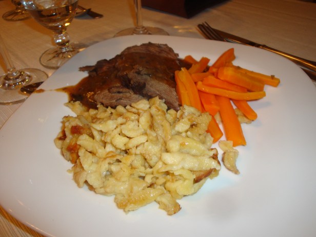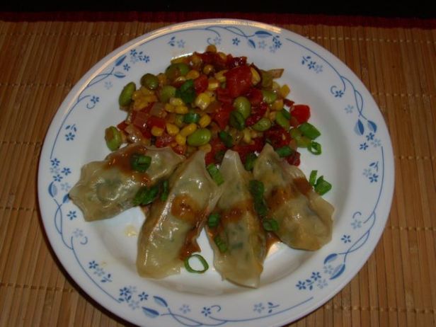Photo by Vincent Giordano. Says Vincent: This is my favorite dish that I photographed: falafel in pita bread dressed on a gold lined plate with tomatoes and lettuce with a garnish. I went on a shoot for a woman who was putting together a Middle Eastern cook book. The best part of the shoot, I was able to eat it afterward...........Perfect!Photo by Patricia Barney. This is a photo of Sauerbraten, with spaetzle and carrots. This dish was actually made by yours truly, for a Kiwanis fundraiser I held at my house. Yes, this is the famous Sauerbraten about which much has been written. Please do not let this fact influence your vote.Photo by Nell Burrows. Note from Nell: This is a centerpiece I constructed from green fruit. Apple, pear, mango, papaya, limes, and grapes on a green leaf shaped platter. I’ve also done it with red fruits – blood oranges, pomegranates, red grapes, plums and red bananas. Quite dramatic and yet – so easy.Photo by Alisa Costa. Alisa did not tell me the name of the recipe (the photo was simply titled "Yumm"), but I am guessing that it is vegetable potstickers (or gyoza) with an Asian succotash on the side. Am I even close?