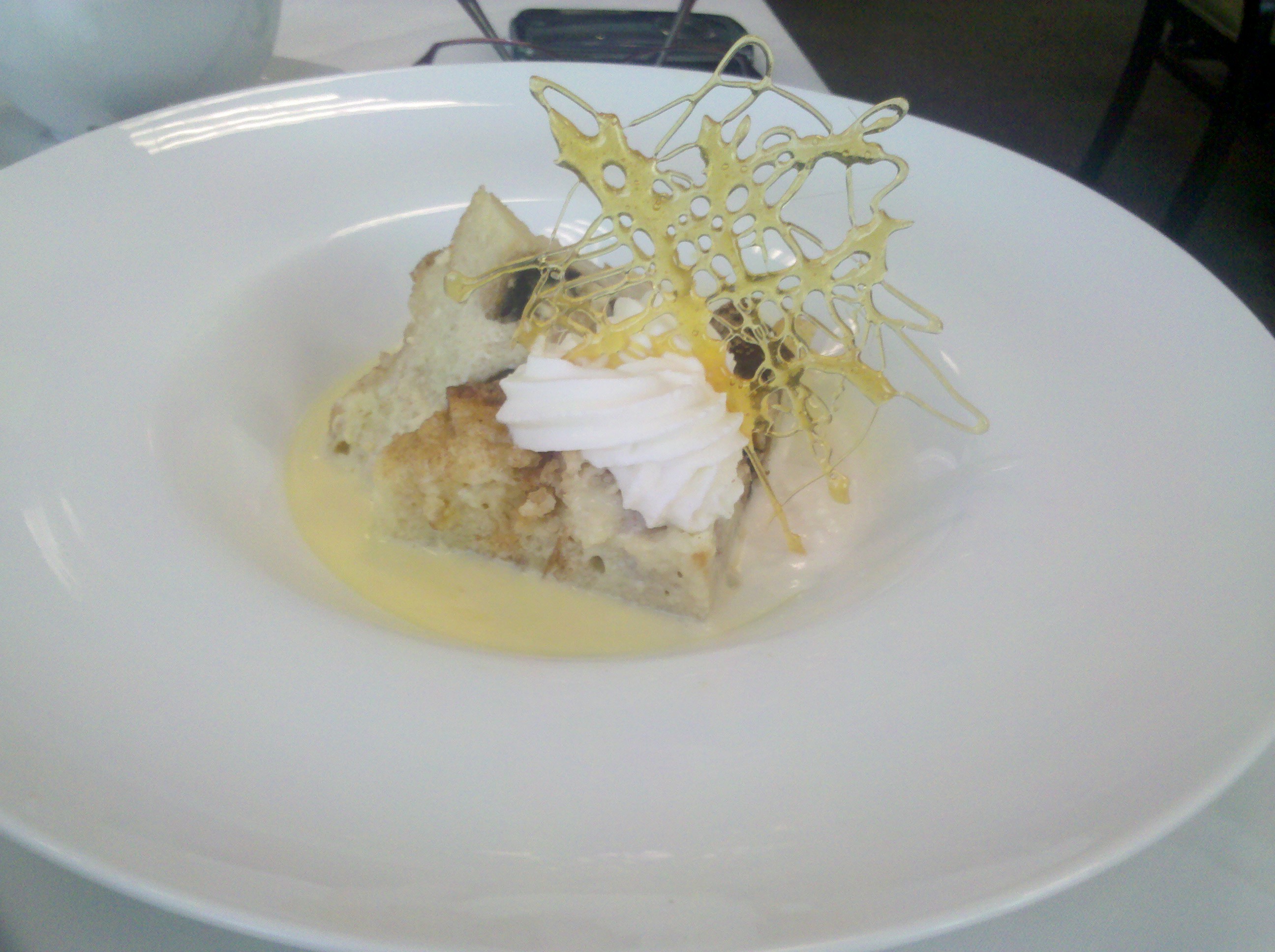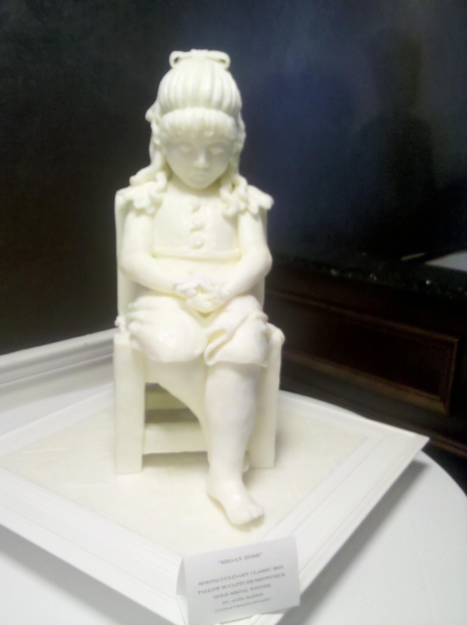 I and my dining companions Maryellen, David, and Jackie (I hope you don’t mind me using your “real names”) arrived at the Casola, and were greeted with a flourishing opening of the dining room doors, where the front of house students were there to take our names and escort us to our tables. As we were entering, we noticed an interesting objet d’art at the desk: a sculpture of a girl in a chair – MADE OUT OF TALLOW (rendered beef or mutton fat, solid at room temperature). It was cool and weird, all at the same time. The card in front says it won the Gold Medal at the SCCC Spring Culinary Classic 2010 (a competition sanctioned by the American Culinary Federation – a pretty big deal). I wish I could read the name on the bottom of the card, so I could give the artist some props. Jay – help me out!