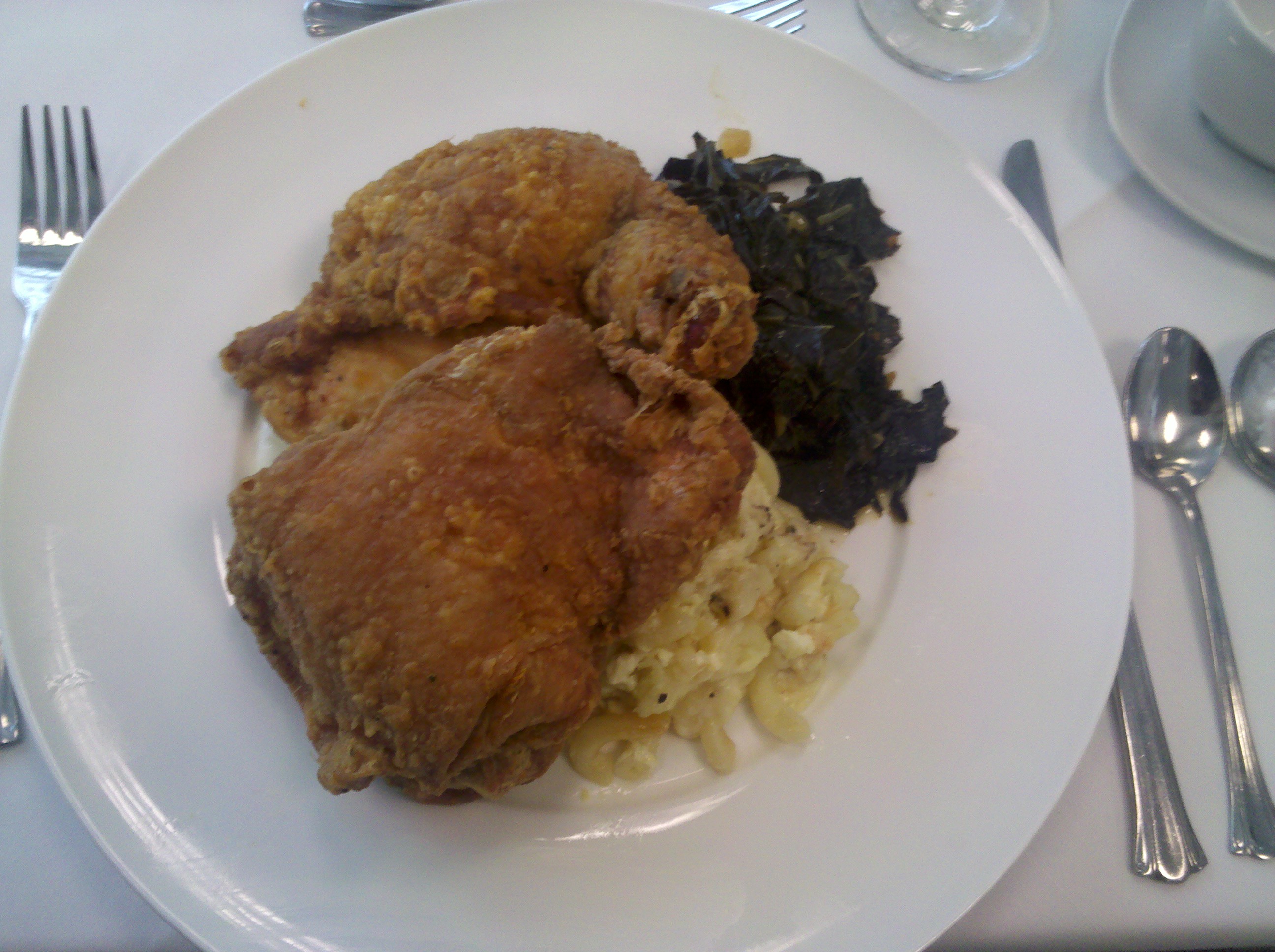 Maryellen and Jackie ordered this, and I only tasted a tiny bit. But what I had was quite tasty – a crispy coating fried onto moist, juicy chicken quarters. The chicken was sauced (underneath the pieces) with Country Gravy, which Maryellen remarked was essentially the ubiquitous sausage gravy you find all over the South. The sides were the same as mine.