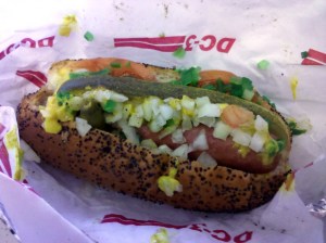 If you’ll remember, BFF Sarah and I visited Capitol Hill hotdogggery DC-3 during my November visit to Our Nation’s Capital. And I liked it so much I went back by myself two days later. Anyway, I just saw that the Food Network show “Heat Seekers” (don’t know it, but whatever) recently stopped by DC-3 to shoot some footage for an upcoming episode.