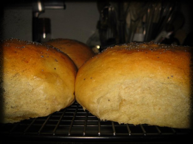 These buns are more than mere hamburger delivery vehicles, too – Bob sliced one up and buttered the slices (they reminded him of the small loaves of bread you get at Spa Brauhaus in Malta), and I made and egg-and-cheese sandwich on one for breakfast this morning. Stellar. I think tomorrow I’m going to try one as part of my favorite guilty pleasure: a peanut butter and butter sandwich. Oh, shut up. I know you secretly like them too.